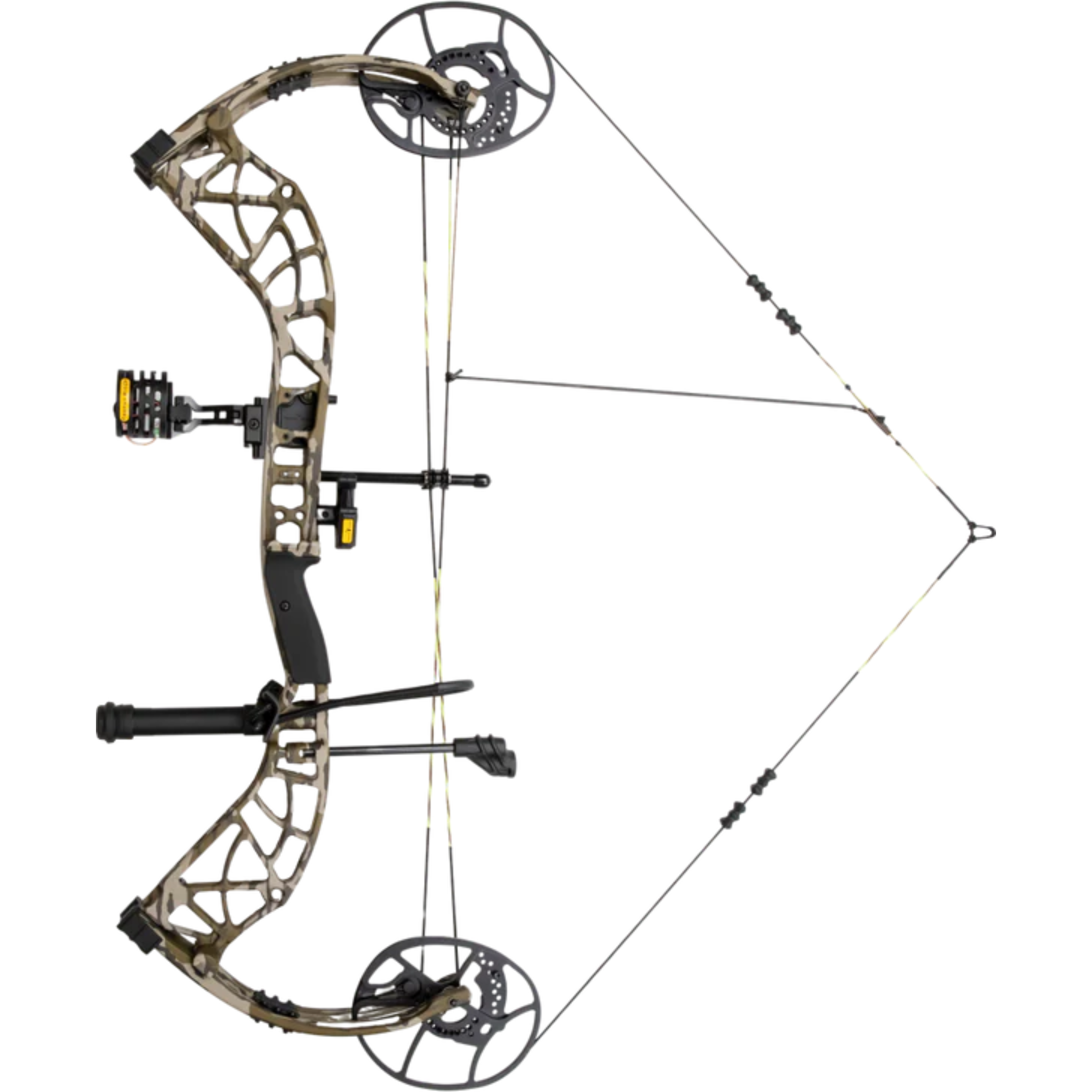 Includes Fatal 4-Pin Sight with Picatinny mount, Whisker Biscuit V Rest with Integrate Mounting System®, Snubnose Stabilizer, 5-Spot Quiver, peep sight, and wrist sling