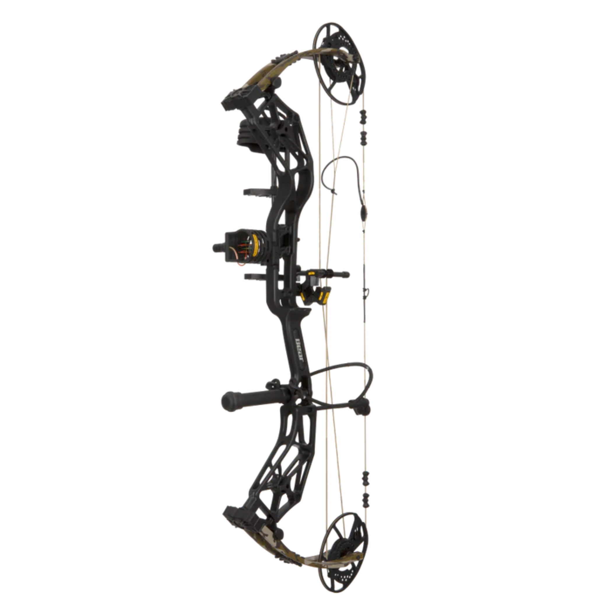 Trophy Ridge Package includes: integrated 4-pin sight, IMS® Whisker Biscuit V, 5-Spot quiver, stabilizer, peep sight, and D-loop.
